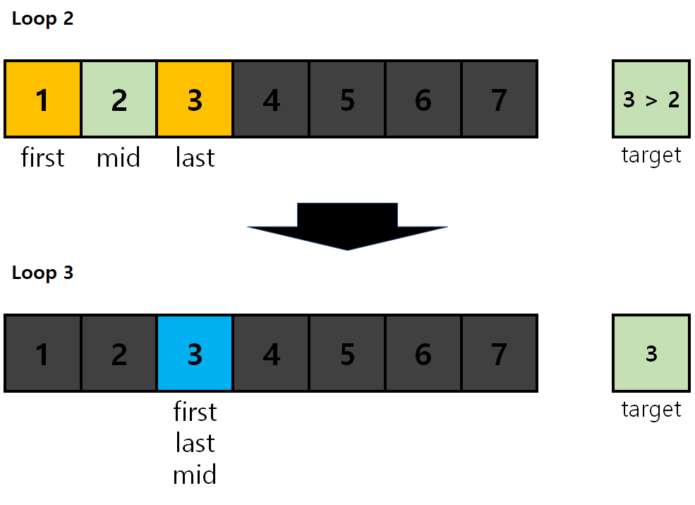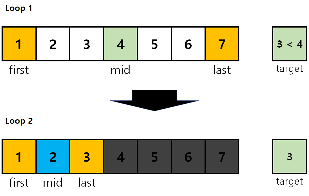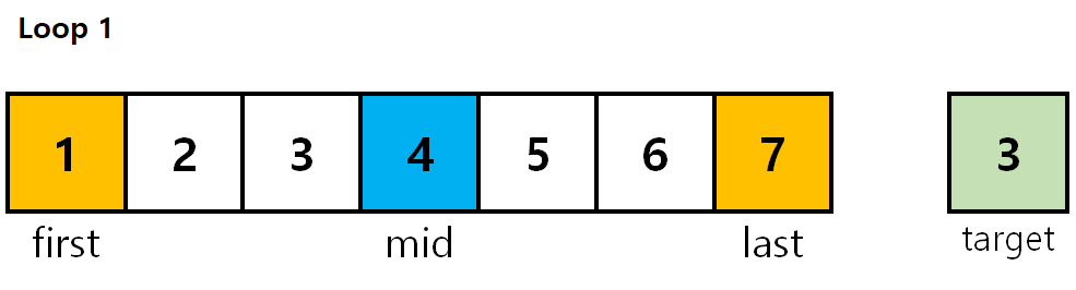 위의 이미지처럼 7개의 데이터가 담긴 오름차순으로 정렬된 데이터에서 숫자 '3'을 탐색한다고 가정해보자. 첫 번재 탐색에서는 위의 그림처럼 first, last, mid 지시자가 정해진다.